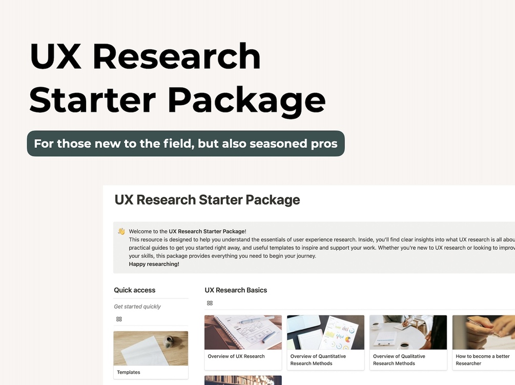 • This UX Research Starter Pack is designed to help you kickstart your UX research efforts, whether you are new to the field or looking to establish a more structured approach to user experience research.